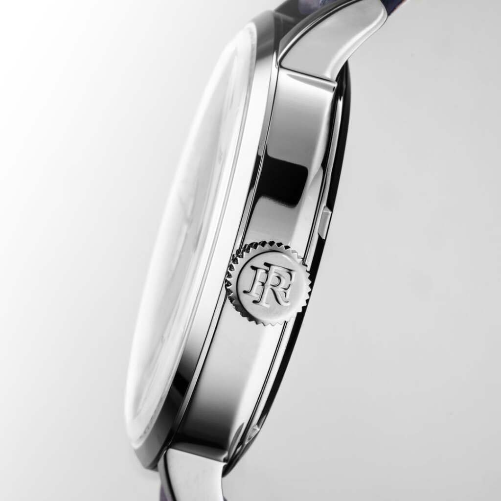 カリブル・イニシャル® 両方向自動巻き上げ 振動数 4Hz (28,800振動/時) 65時間パワーリザーブ 21石 ハック機能(秒針停止機能) 「カタツムリ」をモチーフとしたスネイル装飾と「RF」ロゴのエンボス加工が施された透かし彫りのローターストラップ ジャン・ルソー社製、手縫いの高級アリゲーター革バックル 「RF」ロゴが刻印された、ポリッシュ仕上げのステンレス製尾錠 |