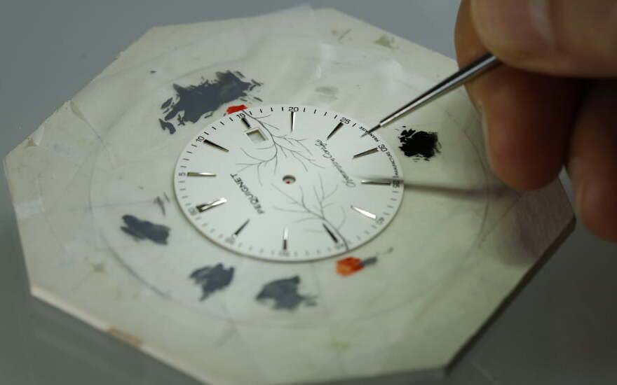 このユニークな時計の中心となる文字盤は、アーティストのフィリップ・ジャカン=ラヴォーによってミニチュアの手描きで描かれており、2本の枝が絡み合う様子が表現されています。