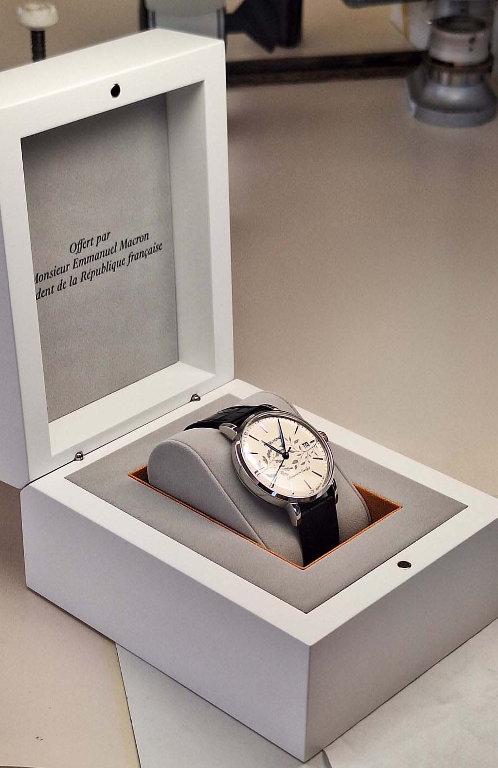 モルトーにある「ラ・プラティーク」の工房では、卓越した伝統の極みであるブルー・スチール製の針が製作されました。また、ブザンソンを拠点とするマニュファクチュール・ジャン・ルソーによって、この時計専用の特別なアリゲーターストラップがハンドステッチで仕上げられました。 最後に、同じくブザンソンに拠点を置くフランス・エトゥイ社が、「アティテュード・インペリアル」専用の特注プレゼンテーションボックスを製作しました。白漆塗りの木材と淡いグレーのスエードにオレンジ色のアクセントを施したこのケースは、贈り物の貴重な性質を際立たせています。内部には「フランス共和国大統領 エマニュエル・マクロン氏より贈呈」という刻印が施され、この一連の品々を完成させています。