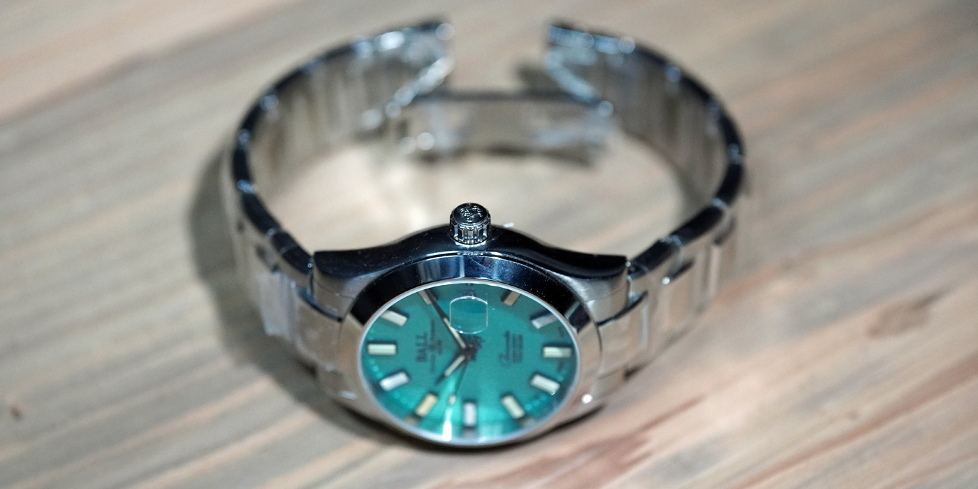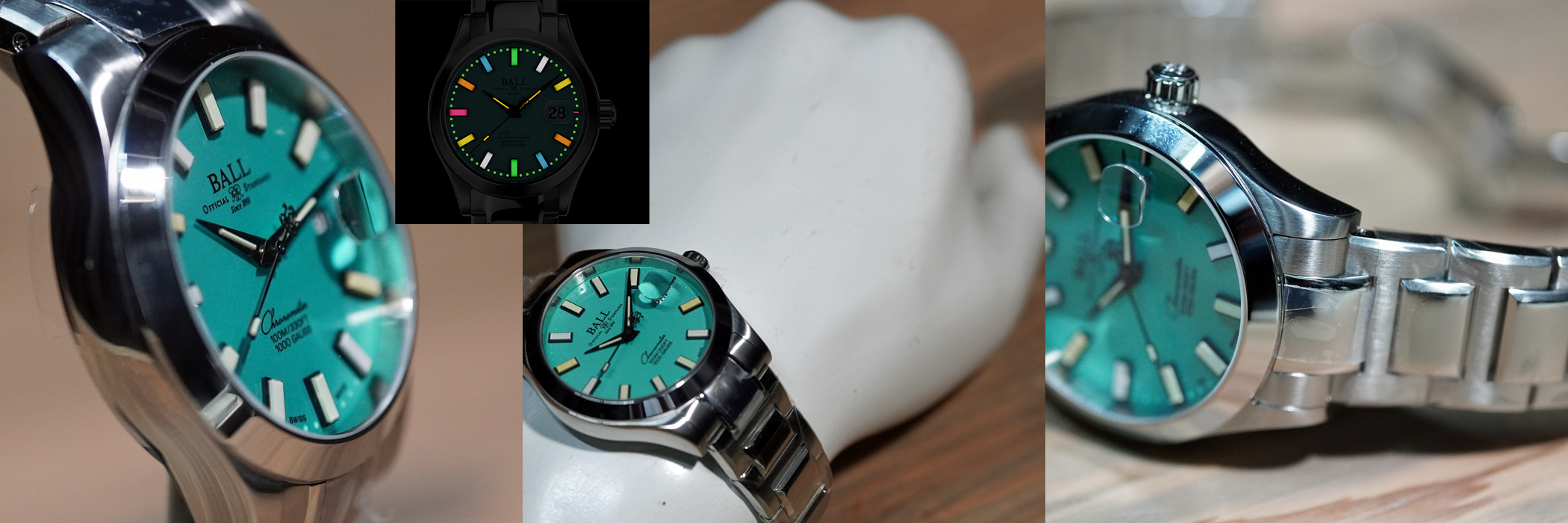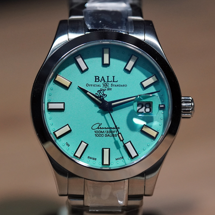 ターコイズブルーダイヤル+ レインボーカラーのインデックス・ミューメタル製インナーケース採用で耐磁性(80000A/m)耐衝撃性(5,000Gs)
